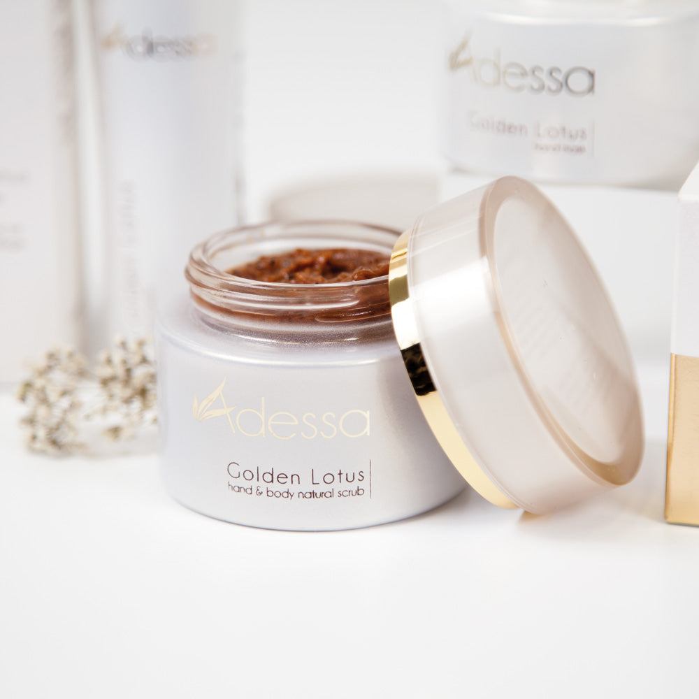 Aromatisches Peeling für Hände und Körper. Adessa Golden Lotus hand & body natural scrub ist ein exklusives Pflegepeeling, das selbst trockene Körperhaut innerhalb kürzester Zeit wieder in voller Frische erstrahlen lässt. Meersalz und pflanzliche Peelingstoffe wie Litschisamen und gemahlene Orangenschalen befreien sanft und gründlich von müden, abgestorbenen Hautzellen. Reines, feinstes Traubenkernöl spendet tiefenwirksame Feuchtigkeit und gibt ein seidig-weiches Hautgefühl. Anwendung: Für ein jugendlich glattes Hautbild Adessa Golden Lotus hand & body natural scrub 1 bis 2 mal pro Woche mit leicht kreisenden Bewegungen auf die trockene oder feuchte Haut auftragen. Danach mit warmem Wasser abspülen. Ergebnis: streichelzarte und unvergleichlich glatte, gepflegte Haut. Ein außergewöhnliches Erlebnis für Körper und Seele!