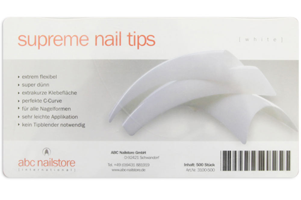 Die Tip-Kollektion von abc nailstore international basiert auf einem hochwertigen Spezialkunststoff. Dank dieses Highend-Materials sind die supreme tips extrem biegsam und elastisch, bruchfest und stabil.