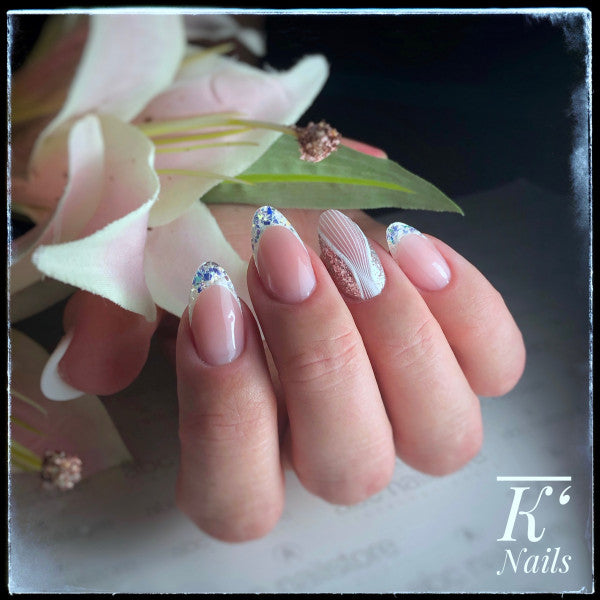 Tragen Sie Ihr artistgel oder delaclight/3DLAC als Fullcover oder French auf den Nagel auf und lassen Sie es 120 Sekunden unter einer UV-Lampe aushärten. Drücken Sie anschließend die geometrischen Zuschnitte der holographic broken glass design foil mit etwas Druck auf die Inhibitionsschicht und streichen Sie sie vorsichtig glatt. Abschließend mit impuls high gloss Gel Ihrer Wahl versiegeln.